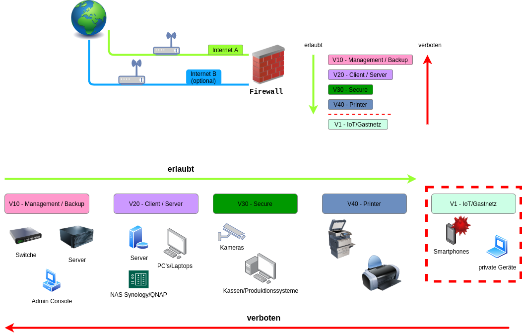 Das Gastnetzwerk hat hierbei überhaupt keinen Zugriff auf Unternehmensdaten, sondern lediglich ins Internet. Wenn sich nun ein infiziertes Smartphone im Gastnetz befindet, kann dieses im Unternehmensnetzwerk auch keinen Schaden anrichten.